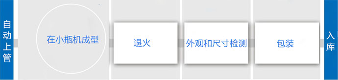 從玻璃管生產出來之后,通過輸送鏈單根輸送到制瓶車間,再通過機器手插到機器上開始進行生產。然后進入遠紅外線電退火爐退火后,再進入在線攝像機檢測系統進行檢測,然后包裝入庫。